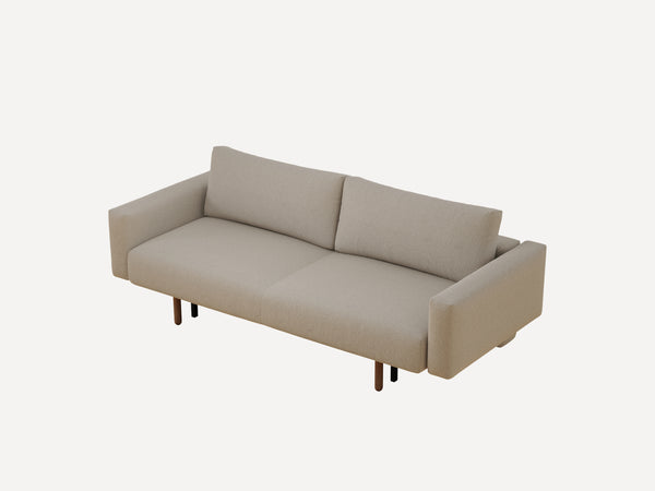 Maya har indbygget opbevaringsplads under sofaen, så dyner, puder og lagner altid kan gemmes væk. Vælg mellem version med eller uden armlæn for at tilpasse sofaen til din stil og plads.
