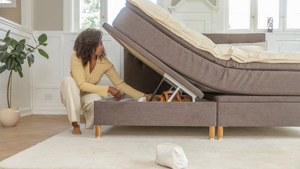 Alva kontinentalseng har et integreret opbevaringsrum i sengens base. Opbevaringsrummet er bygget af solidt, tykt, svensk fyrretræ, som giver en stabil base, bygget til at holde. Opbevaringsrummet er nemt at åbne og lukke, og kan nemt betjenes af én person.